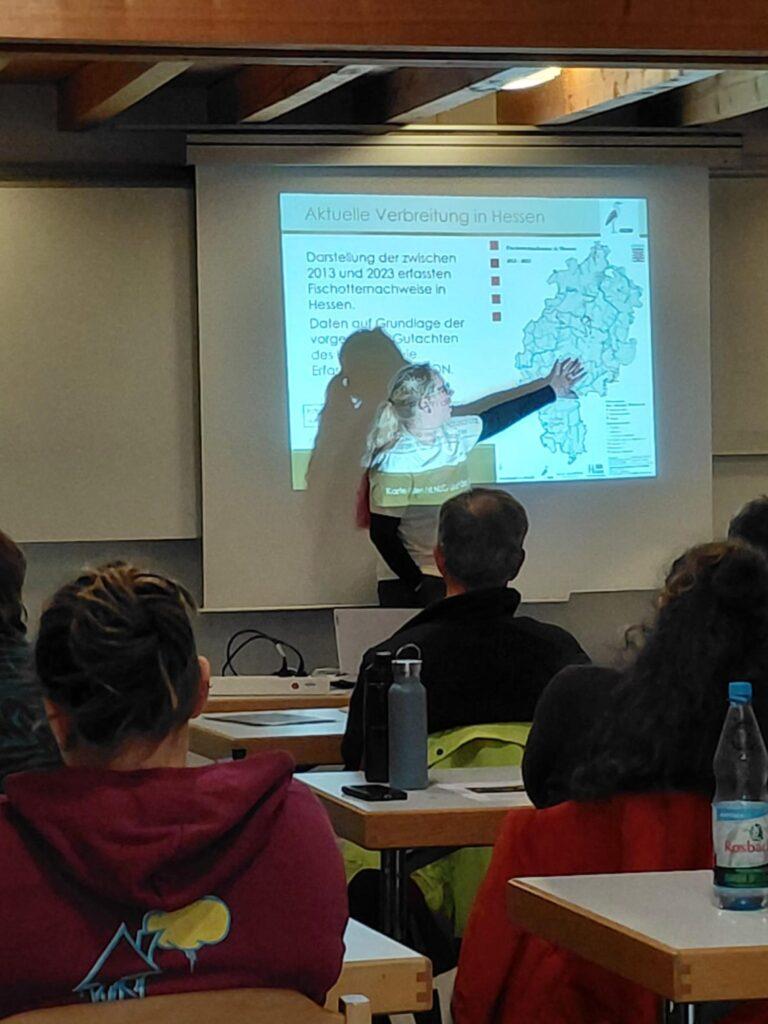 Die Veranstaltung bot eine ausgezeichnete Gelegenheit, um Mitarbeitende aus Forst und Planungsbüros für die Thematik zu sensibilisieren und auf den neuesten fachlichen Stand zu bringen. Gleichzeitig konnten potenzielle neue ehrenamtliche Kartierer*innen gewonnen werden – etwa unter den anwesenden Biberbetreuer*innen, die künftig auch Hinweise auf Fischotter erfassen möchten. Auch die anwesenden Studierenden und angehenden Biolog*innen zeigten sich hochmotiviert, ihr Engagement im Artenschutz künftig auszubauen und bei der weiteren Erforschung der Fischotterverbreitung in Hessen mitzuwirken.