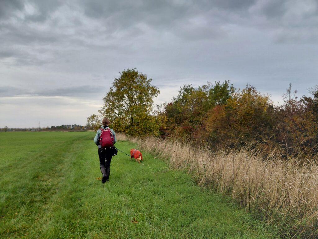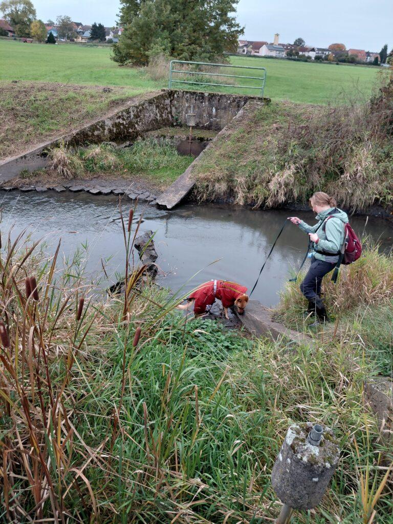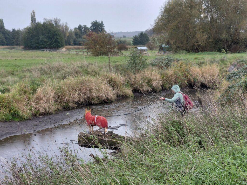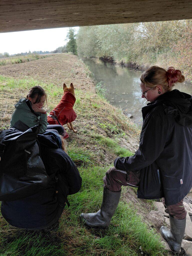Am 20. Oktober war das UFZ mit Spürhund-Unterstützung bei uns in Hessen. Wir waren auf der Suche nach Nachweisen an der Horloff bei Echzell im Landkreis Wetterau unterwegs. Hier soll in diesem Winter ein Stück des Fließgewässers renaturiert und der Lebensraum auch für den Fischotter aufgewertet werden. Um vergleichende Ergebnisse zu haben, wurde zunächst ein Stück entlang des zu renaturierenden Bereiches untersucht und im Anschluss ein Kontrollstück im angrenzenden, bereits renaturierten Bereich. Dasselbe soll dann nach der Renaturierung wiederholt werden. Die Spürhündin war erfolgreich und konnte insgesamt an drei verschiedenen Stellen Losung des Fischotters nachweisen.